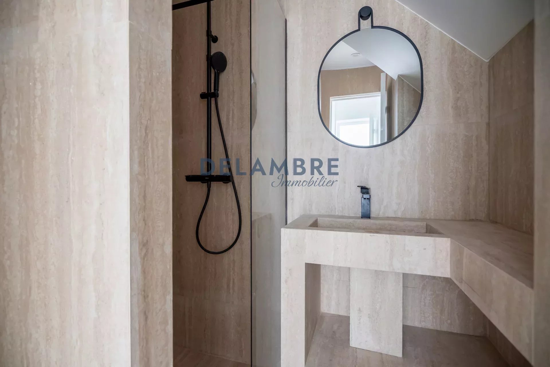 d’une salle d’eau contemporaine avec douche à l’italienne et WC.