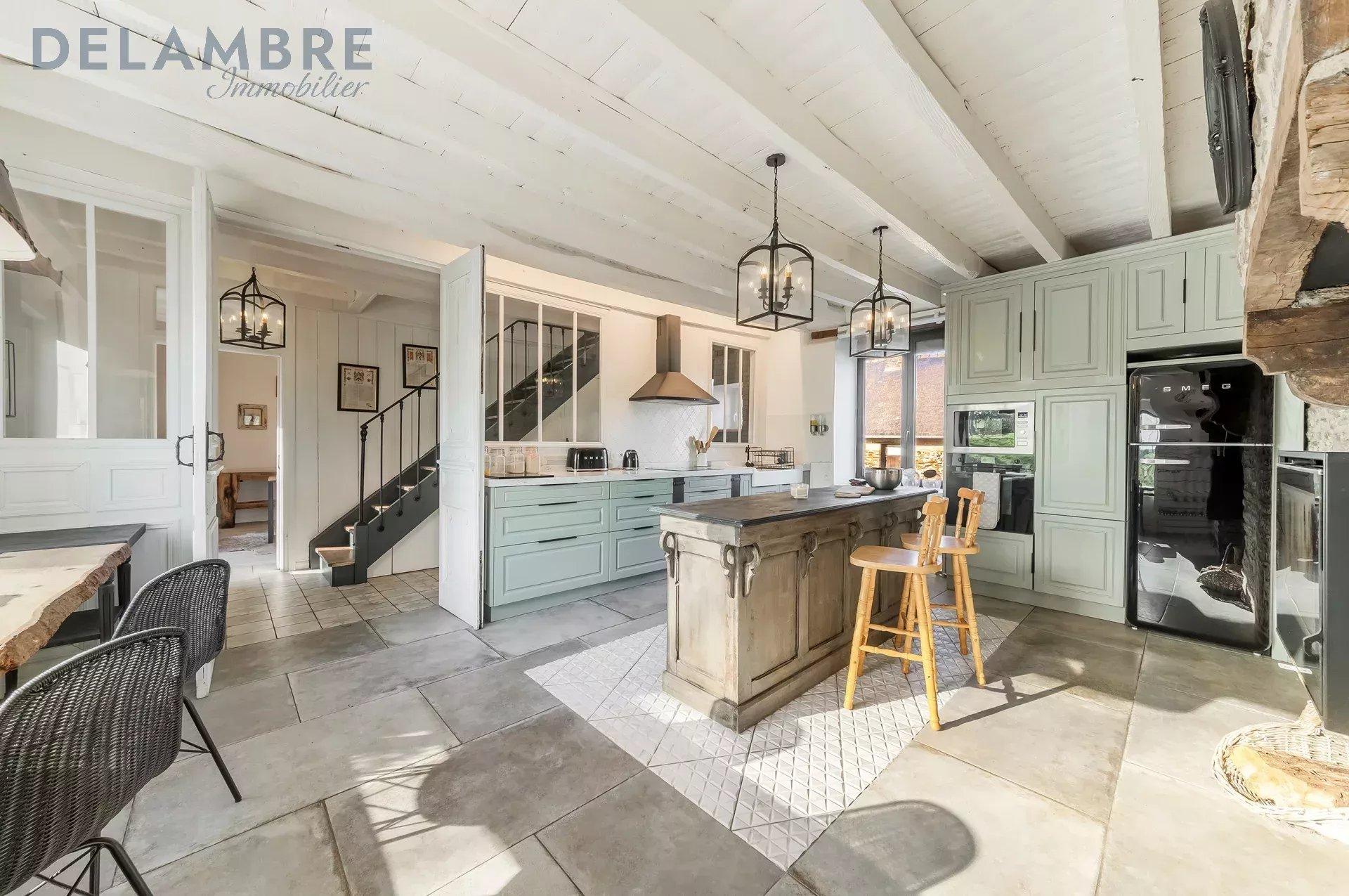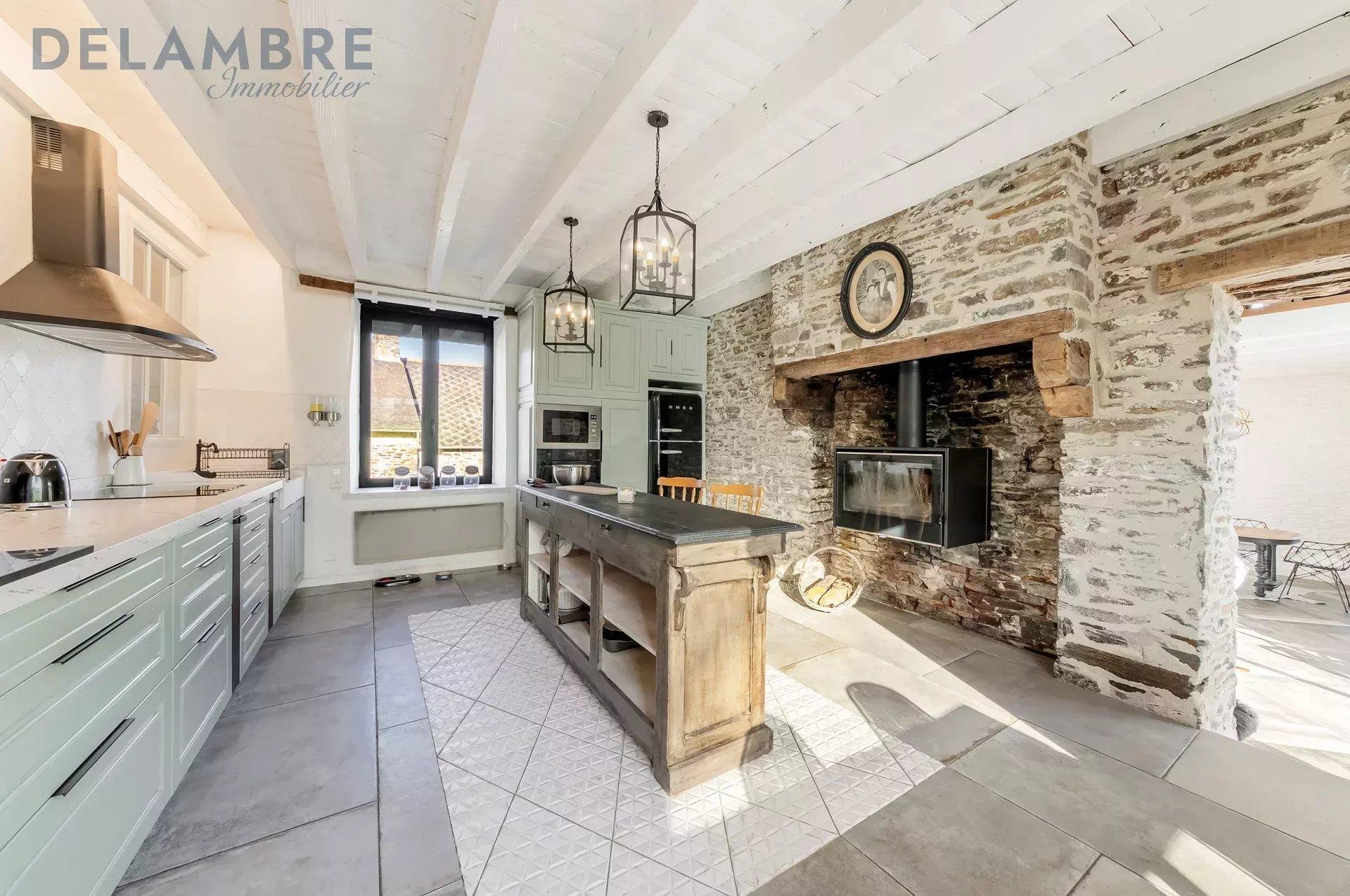 Cuisine aménagée et équipée avec cheminée, ouverte sur un vaste salon-séjour lumineux avec cheminée (ensemble d’environ 70 m²)